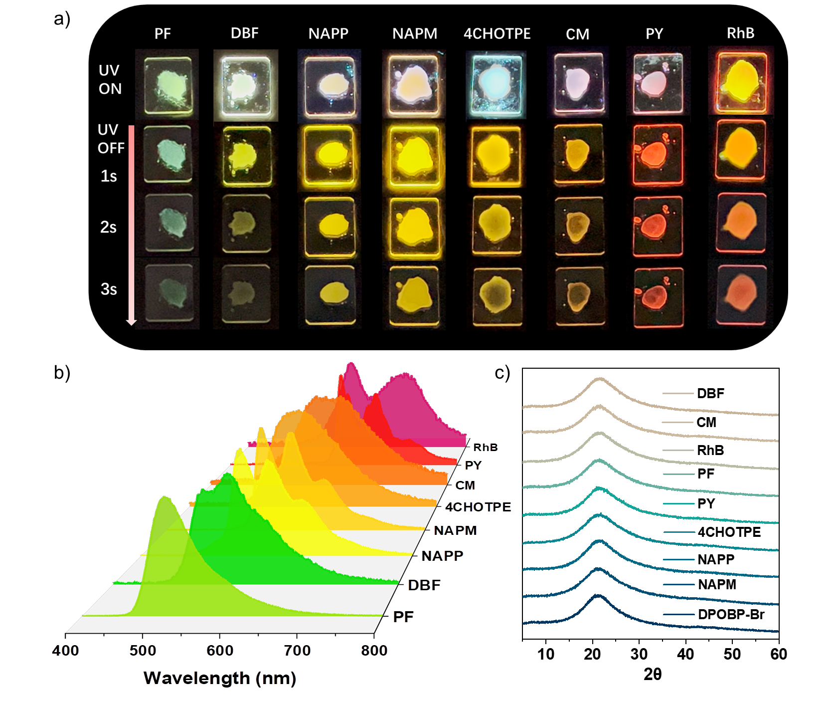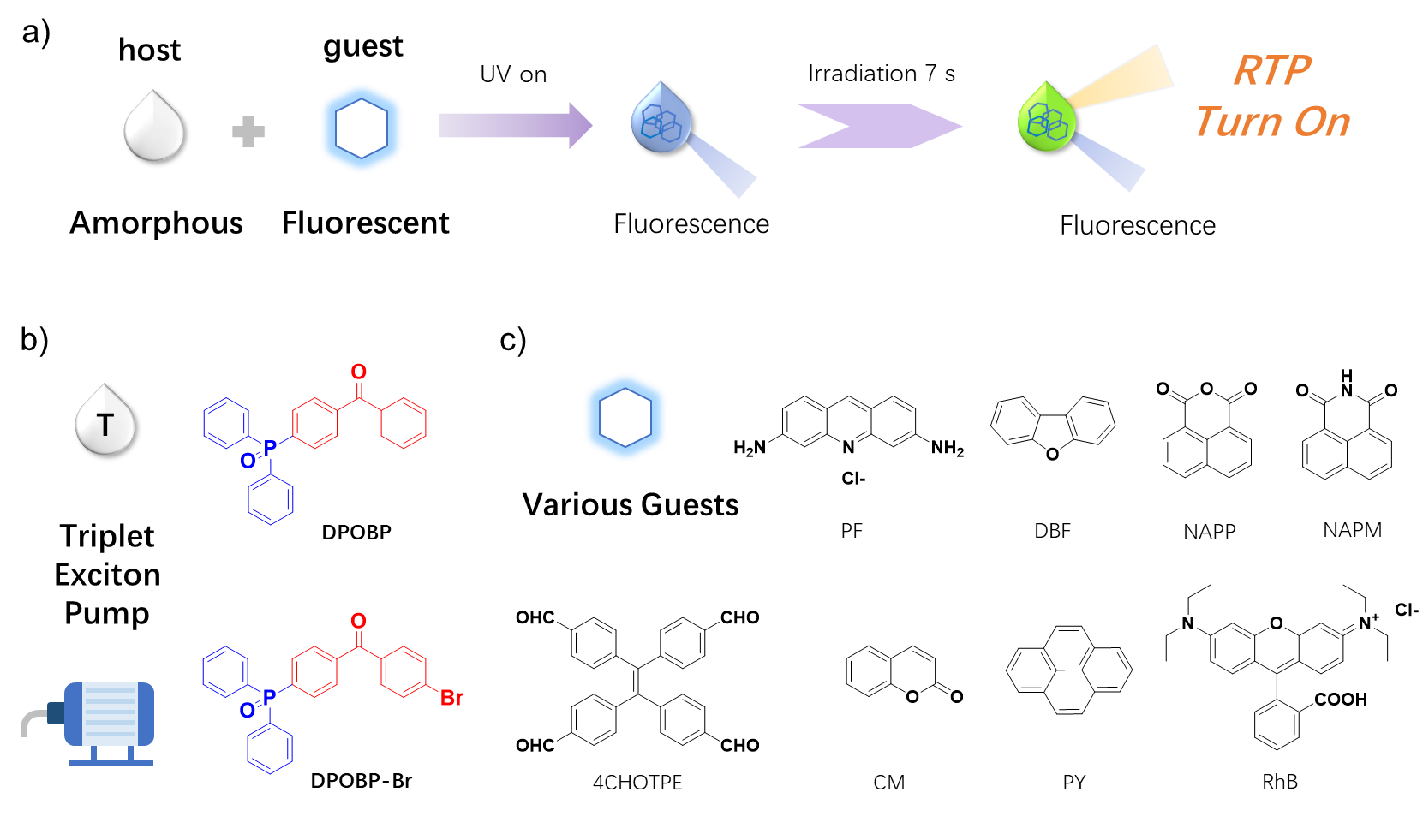 近日,化学院的池振国教授、杨志涌副教授研究团队通过将4-溴-二苯甲酮和二苯基氧膦结合,设计合成了一类新型无定形有机小分子主体DPOBP-Br。该主体不但可以形成连续的透明无定形薄膜,而且可以作为一台“三线态激子引擎”,激活掺杂在其中荧光客体的RTP。将各种类型的商用有机荧光分子(包括分子和离子,ACQ和AIE荧光材料,纯碳氢分子和含杂原子、杂环分子等)按1%的质量比掺杂到主体DPOBP-Br中,通过简单的加热冷却即可获得室温磷光性能各异的小分子无定形掺杂薄膜(图1)。
