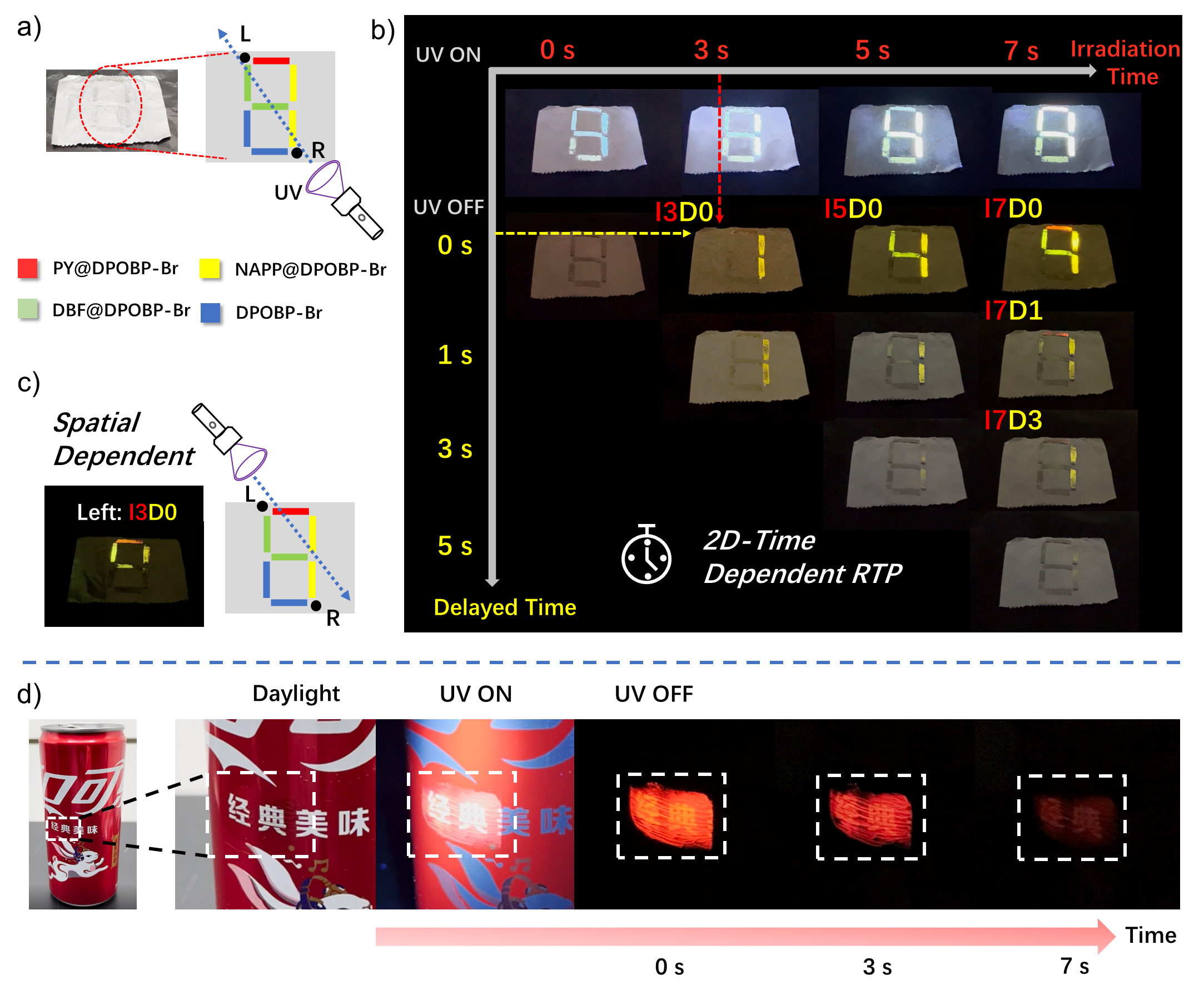 图2基于无定形掺杂体系动态室温磷光的具有时空分辨的防伪应用。