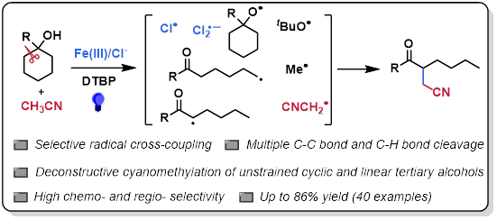(31) Qiang Wu,‡ Wei Liu,‡ Miao Wang, Yahao Huang, Peng Hu*, Iron-catalyzed deconstructive alkylation through chlorine radical induced C–C single bond cleavage under visible light. Chem. Commun., 2022, 58, 9886–9889. (Hot paper)
