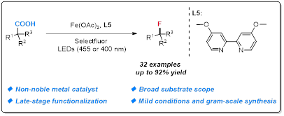 (30) Yu Zhang, Jiahui Qian, Miao Wang, Yahao Huang, Peng Hu*, Visible-Light-Induced Decarboxylative Fluorination of Aliphatic Carboxylic Acids Catalyzed by Iron. Org. Lett. 2022, 24, 5972−5976. (Featured by Synfacts, 2022, 18, 1210)