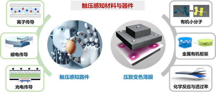 压致变色材料与薄膜。围绕高精尖机械零部件制造与装配过程对界面压力的精准检测,采用有机小分子构型转变、金属有机框架结构转化、压致反应变色以及压致透明等压敏机制,研制新一代高性能压力传感薄膜,实现界面压力分布的高分辨精准成像。