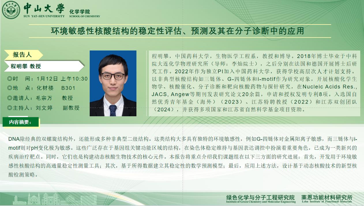 导航痕迹 含羞草 科学研究 学术报告 2026年1月12日讲座论坛:环境敏感性核酸结构的稳定性评估、预测及其在分子诊断中的应用 2026年1月12日讲座论坛:环境敏感性核酸结构的稳定性评估、预测及其在分子诊断中的应用 发布日期:2026-01-08